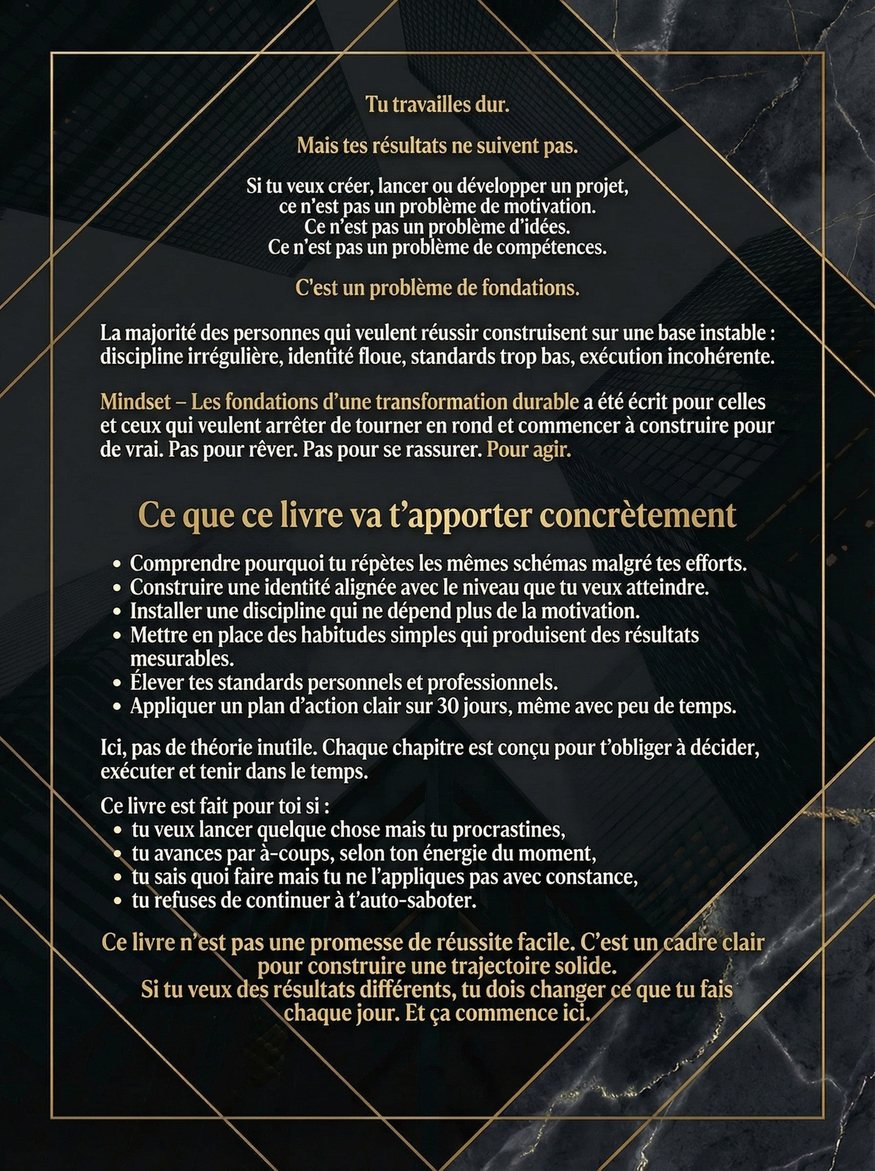 Cet e-book est un guide concret pour celles et ceux qui veulent arrêter de tourner en rond et construire une discipline durable, sans dépendre de la motivation. Tu y apprendras à poser des fondations mentales solides, devenir la personne qui mérite sa vision, créer des habitudes et un système qui tiennent dans le temps, élever tes standards personnels, comprendre le mindset entrepreneurial réel et appliquer un plan d’action clair sur 30 jours. Pas de discours vide. Pas de promesses irréalistes. Un cadre simple pour penser juste et agir efficacement. Ce livre s’adresse à ceux qui veulent construire, pas rêver. Télécharge-le et commence aujourd’hui.